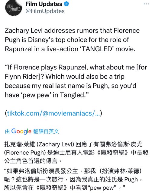 柴克萊威 (Zachary Levi) 回應了有關佛羅倫斯-普伊(Florence Pugh) 是迪士尼真人電 影 《魔髮奇緣》 中長髮公主角色首選的傳言。 “如果佛羅倫斯扮演長髮公主,那我(扮演弗林-萊德)呢?這也將是一次旅行,因為我 真正的姓氏是Pugh,所以你會在 《魔髮奇緣》 中看到“Pugh Pugh”。 https://i.imgur.com/i3W7tEn.jpg
