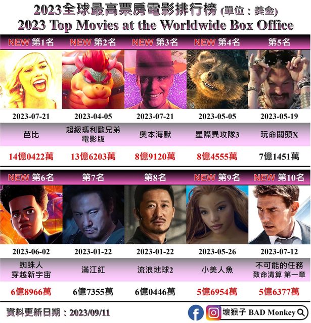 標題[新聞] 芭比全球近452億穩坐年度冠軍!IMAX