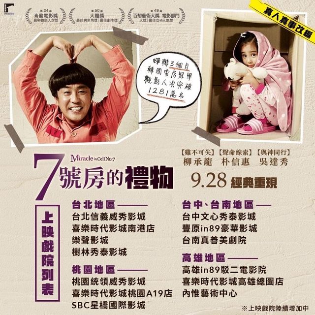 標題[情報] 柳承龍 朴信惠《7號房的禮物》上映戲院