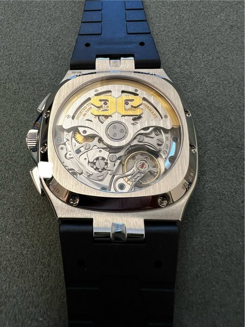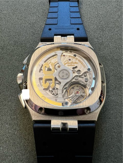 : 日期pusher快調。德式工藝華麗機芯與透背。機芯 flyback chrono on/off 小槓桿玩