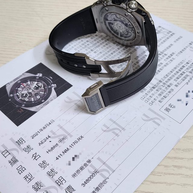 【配件】:宇舶原廠內外錶盒 錶盒有自然分解現象,保證卡,說明書,吊牌,知名二手