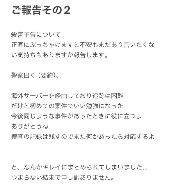 : 幾天後網路上出現了揚言要殺害石恵老師的留言