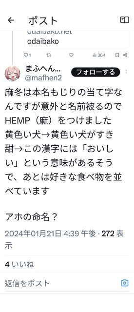 麻冬HEMP(まふゆヘンプ)老師有個分身帳號まふへんちゃん@mafhen2