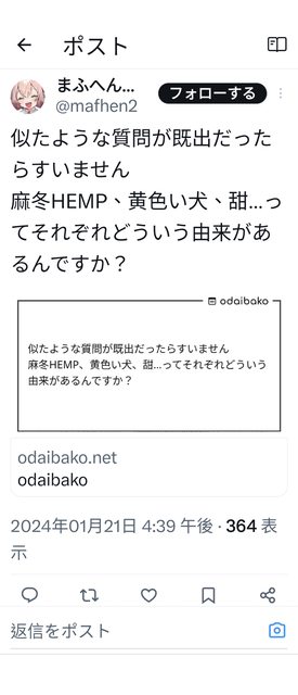 今年1月21日時就有人問說老師的三種筆名(麻冬HEMP、黄色い犬、甜...)有由來嗎