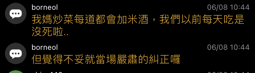 → borneol : 我媽炒菜每道都會加米酒,我們以前每天吃是沒死啦.. 06/08 10:44