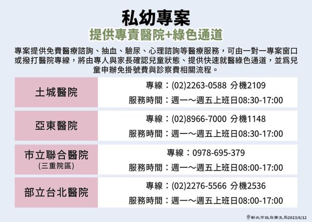 在官網公開查閱,家長可直接撥打專線,經專人確認兒童狀況後,協助安排市立土城醫院、