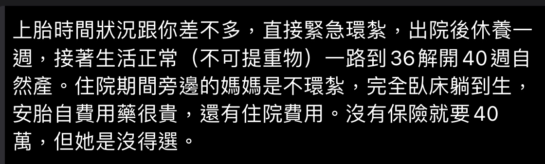 → onetti : 太一樣。而且環紮了也不保證不會需要臥床。 06/17 15:35