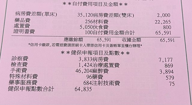 一開始因住院當天只有兩人房,開刀當天單人房只剩尊爵病房,後就入住尊爵病房