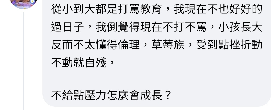推 zyxcba5 : 其實遇到那種支持體罰的家長留言也不會去反駁,自07/03 13:11