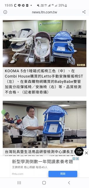 : 稱行政院消保處)於去(111)年10月採樣10件斜躺搖籃進行檢測,今(20)日公布檢驗結