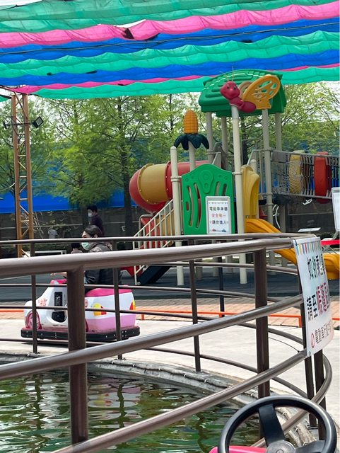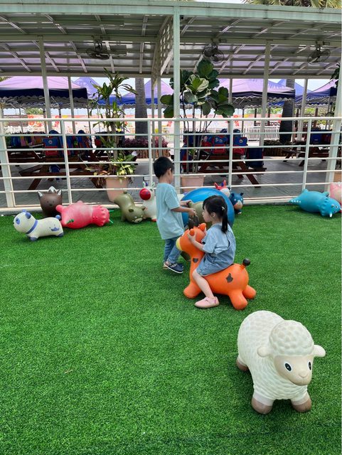 遊戲區種類多樣、溜滑梯、造型搖搖馬、滑草、沙坑、還有付費的小汽車區,寶貝們充分