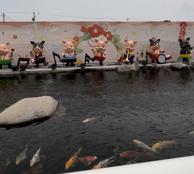 大大的魚池馬上立刻買飼料餵食,還有可愛的小豬們音樂伴奏!