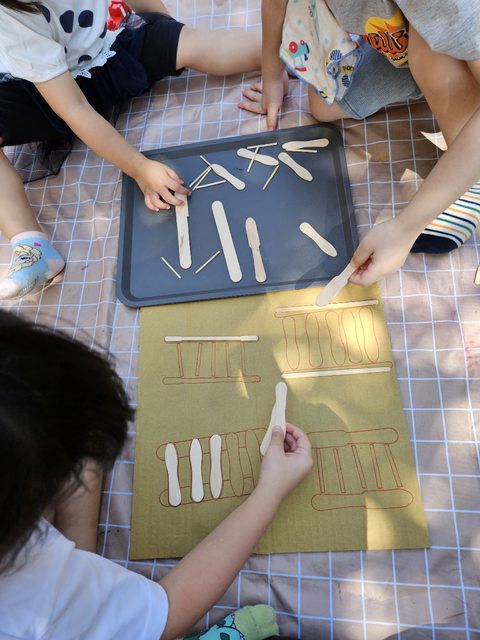 用冰棒棍做了一個排列組合的小遊戲,請孩子們找出對應的冰棒棍,拼出各種梯子的形狀