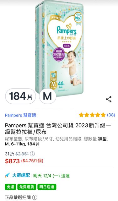 酷澎 幫寶適一級幫拉拉褲 M 184片 特價873元(4.75元/片),之前最便宜只買過MOMO特