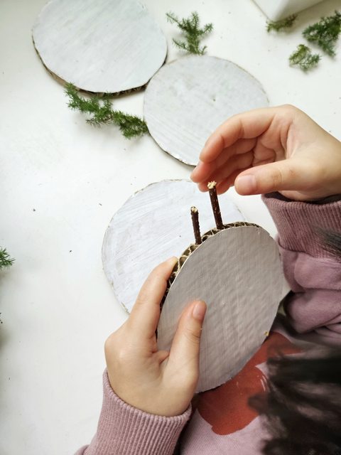 用壓克力彩塗白、中間用樹枝連接