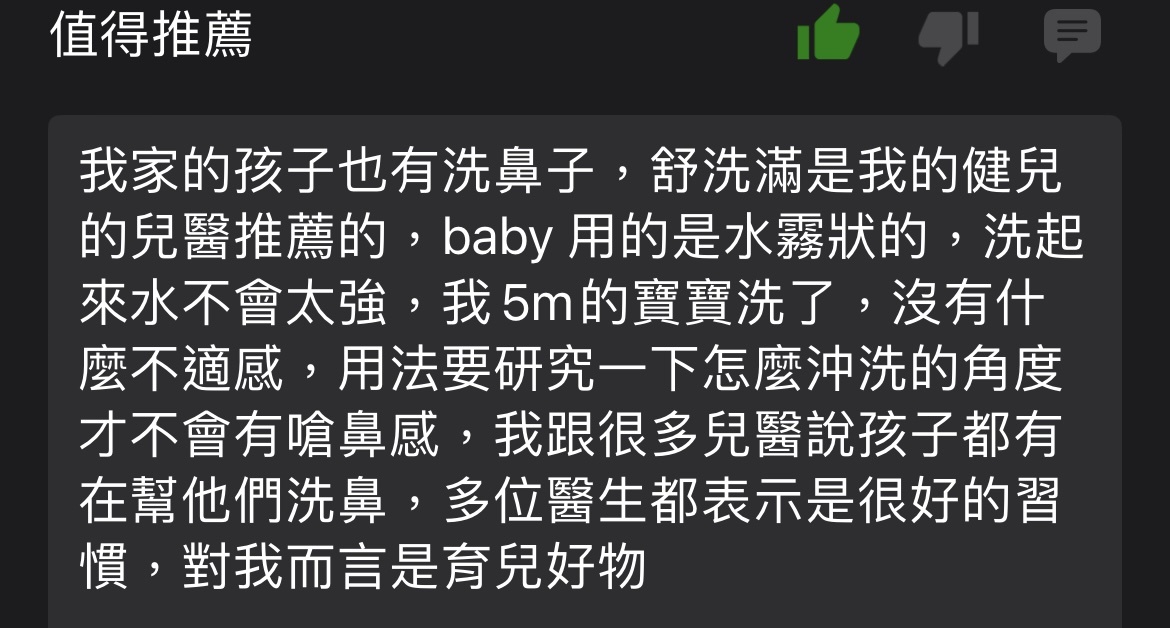 推 bellaisa : 洗鼻子我們是大人先洗,抓角度和溫度,順便洗給孩子 09/02 10:09