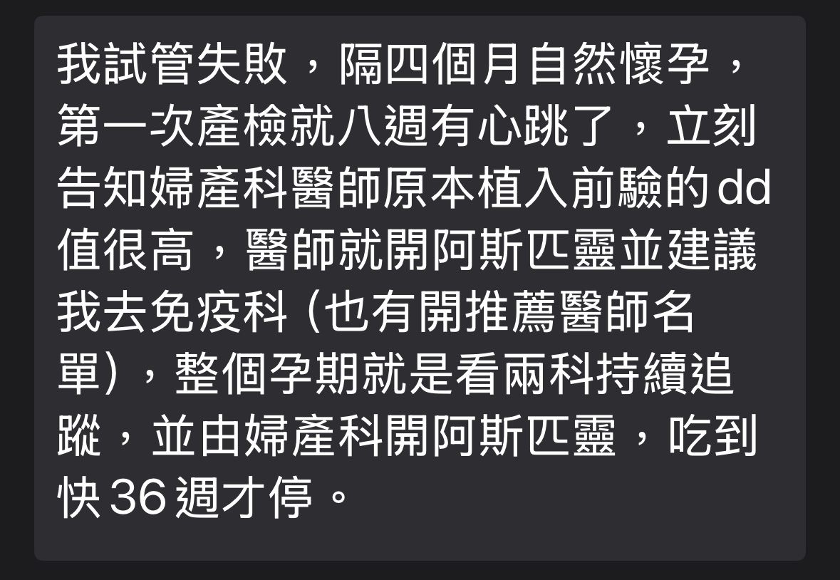 → JYN668 : 免疫數值與用藥都是婦產科醫師開立調整的。如果能 09/27 21:31