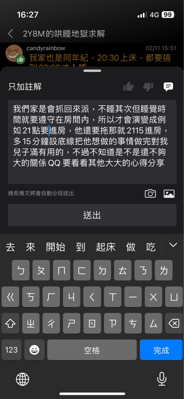 推 candyrainbow: 我家也是同年紀,20:30上床,都要搞到22:00才入睡。 02/11 15:51