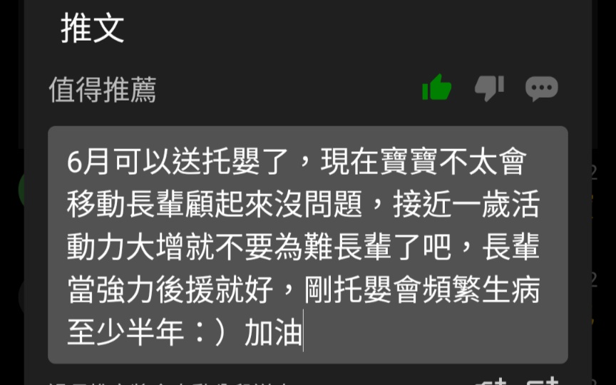 → dodonini : 我自己後援很遠所以2個月就托嬰。找到讓自己放心的02/12 08:52