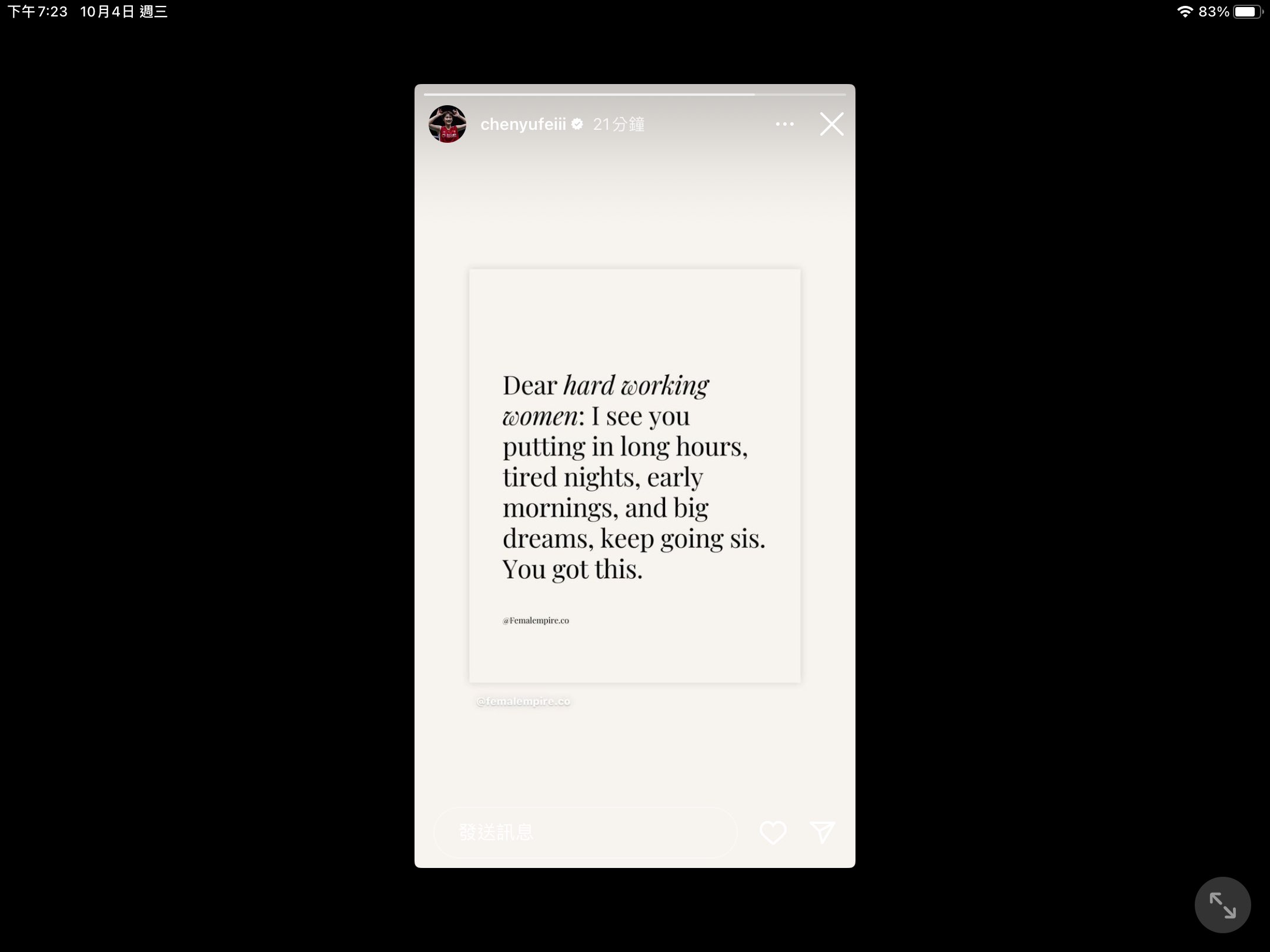 推 pssunny123 : 說不定雨菲發限動的同時也有DM給戴(繼續腦補 10/04 19:44