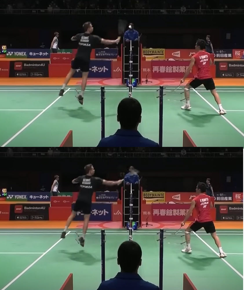 → moritsune : 羽毛已過網,所以他是打到羽毛,擊球點在他這邊吧 11/16 19:48