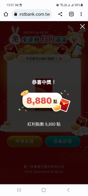 → ivanami: 一銀去年就是不同點數分開入帳,尤其去年參加的方式更方 03/18 20:40