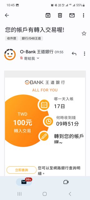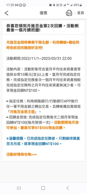 推 iamhsg: 奇怪 王道第二次100還沒入帳耶~ @@" 一樣有收到通知說符合 03/17 14:12
