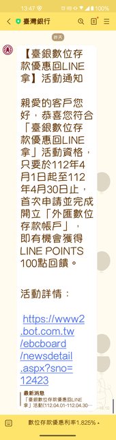 標題[情報] 4/1-4/30 (分眾?)「臺銀外幣數位存款優惠回LINE拿」活動