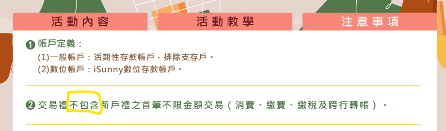 → tourism1003: 『交易禮不包含新戶禮之首筆不限金額交易』 03/24 21:13