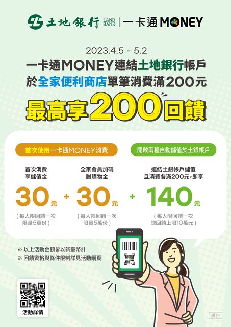 【一卡通MONEY】「連結土銀帳戶於全家便利商店付款,單筆滿200最高享200回饋!」