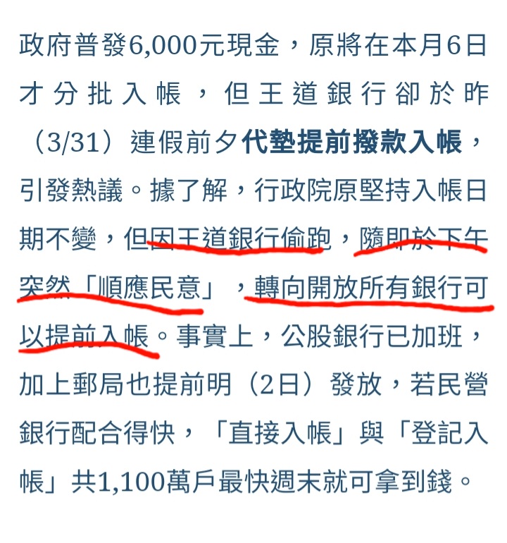 → Machinator: 4/2號就會入帳,沒理由一間民營銀行的行政效率比不過 04/01 18:13