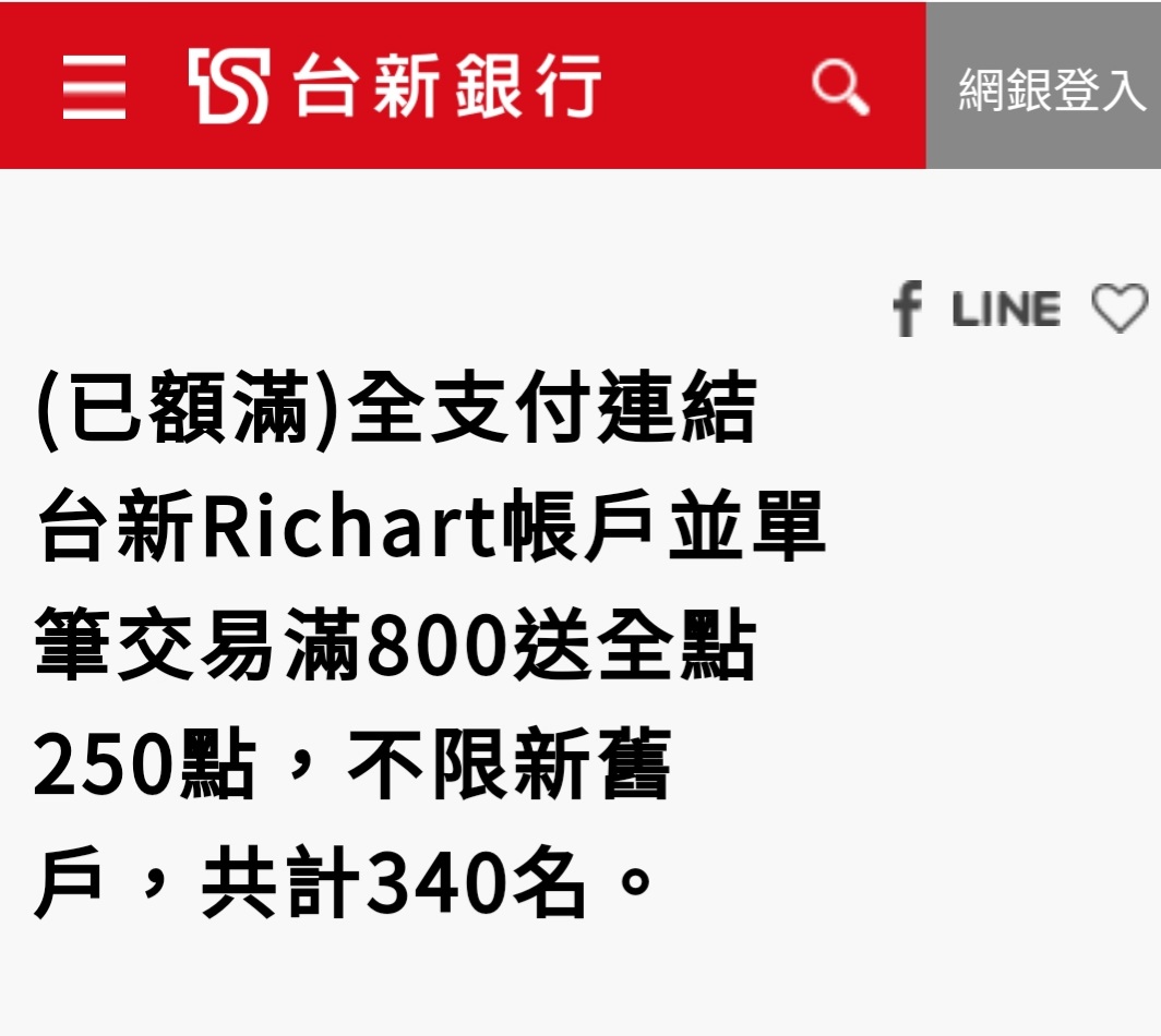 推 TZUYIC: 額滿時間點也沒寫,台新你在混嘛! 06/13 18:45