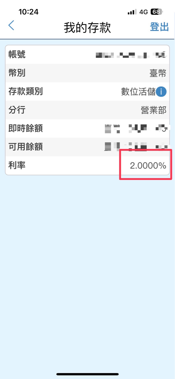 推 gency: 請教舊戶目前看到app上數位帳戶顯示利率還是2%是正確的嗎? 07/04 15:35