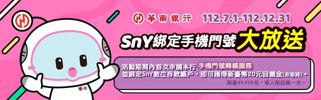活動期間內首次申請開通本行「手機門號轉帳服務」並綁定新臺幣SnY數位存款帳戶,即