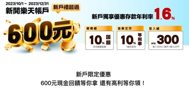 標題[情報] 樂天銀行新開戶 存錢繳費雙10%回饋