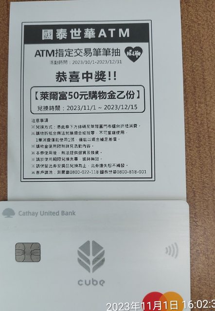 推 jambug: 每月六次國泰無卡提款 都有中一次50券 已經連續好幾個月了 11/03 01:37