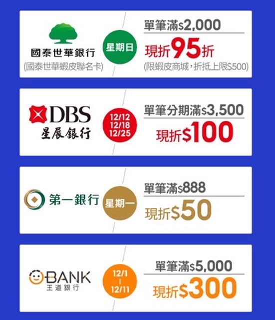 星展銀行:單筆分期滿6000回饋500,單筆分期12000回饋2000(12/1~12/12)