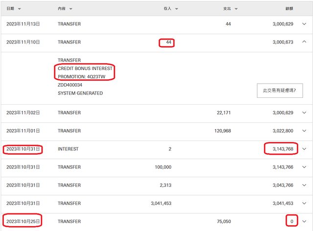 : 11/10正確入帳加碼的0.5%活存利息(怕算法有差我稍微留buffer所以不是剛好42)