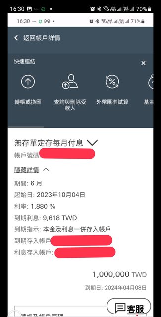 : 我原定存三百萬上月到期 10/25再加三百萬新資金做1.88%定存