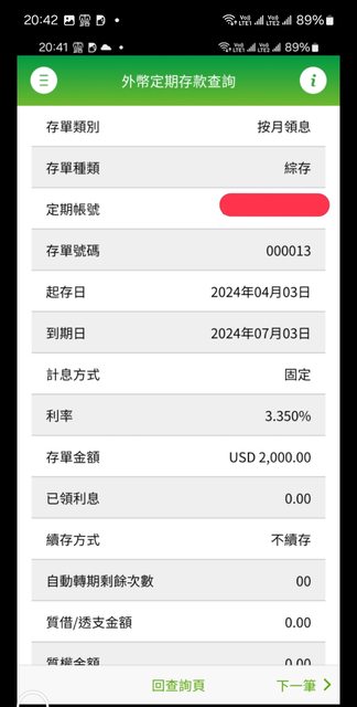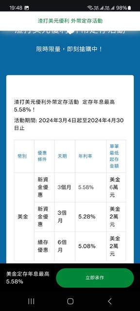 京城到期→渣打3個月→星展3個月 →渣打1Q→星展1Q 渣打走時,當日帳上有300萬活存墊底 星展走時,當日帳上有200萬活存墊底 滾蛋去別間擺無成本,免付1毛$_$就滾 當日到期永遠是別間的新資金 --- 匯豐舊戶吃土,都比上述幾間專案美定低,舊戶美定低於5%是常態,極不優 請多擺點台幣2%定存為上策,盡全力擺 https://i.imgur.com/qPArO2d.jpg