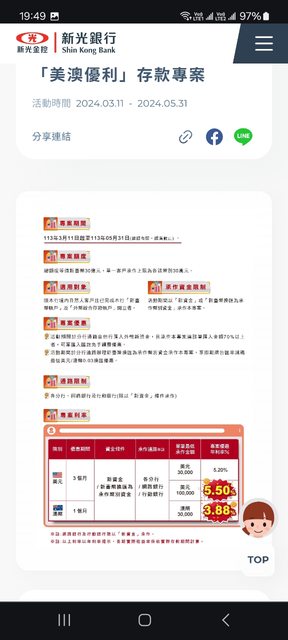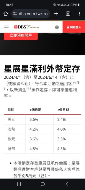 我手中的$_$遠>>>>30萬美, 新光最大30萬美,還不夠擺 Q2 最大到5.5~5.6% 我又是星展/渣打VIP 直接說結論 --- 京城目前空窗期,除了階梯美定有貨, 只能每個月都作京城2千美,利息手動複利 https://i.imgur.com/mo4OsND.jpg