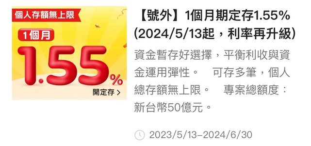 → chienting22: 想存生活預備金 一個月1.55%+一年2.2%正解。如果是 05/15 07:41