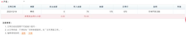 各位有參加活動的朋友久等了,手機門號活動70元回饋金已於今日12/19入帳,