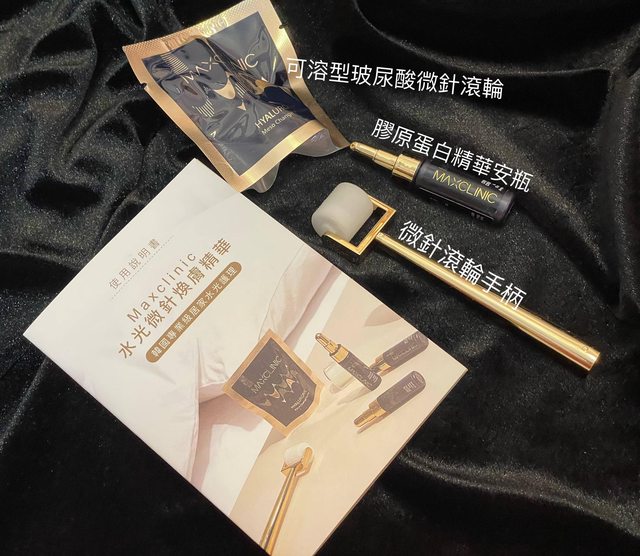 打開看禮盒裡面有膠原蛋白精華安瓶、玻尿酸製成的可溶性微針滾輪和金色手柄