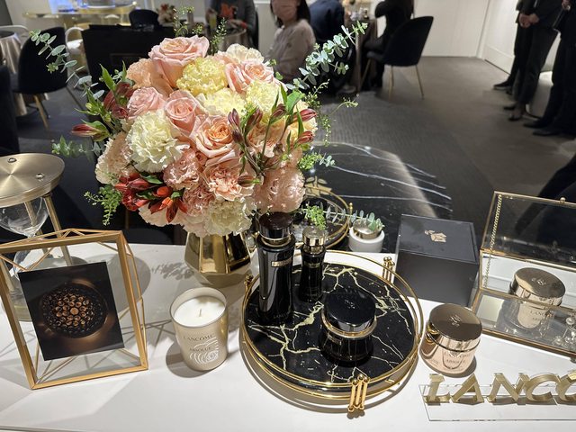空間擺設得很美,都是鮮花配上黑鑽跟絕對完美系列的保養品