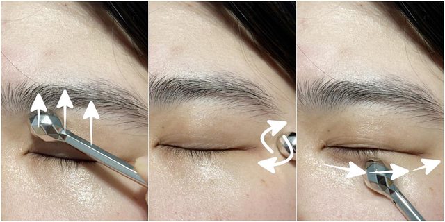 1.用按摩棒在眉下眼上區域,朝眉毛輕輕施壓