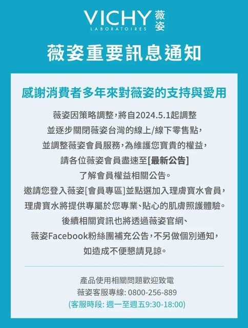 → loewe1846: 跟買Vichy的客人說5/1全面撤出台灣市 49.217.135.151 02/06 14:52