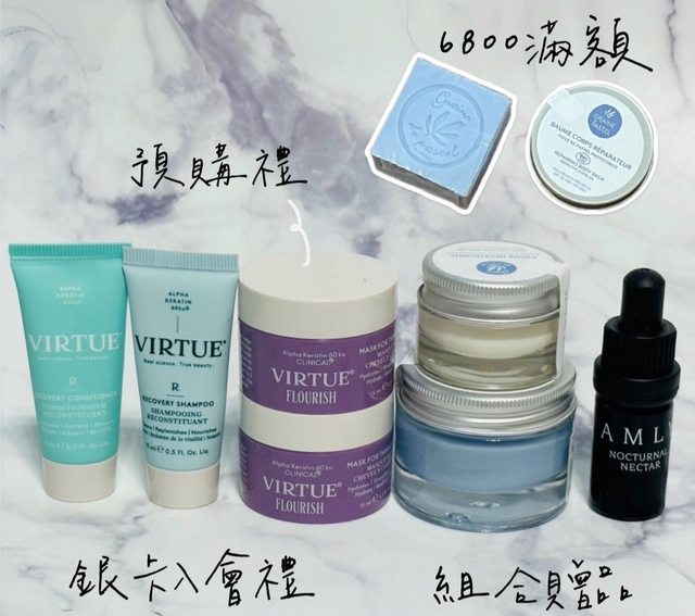 從左到右是銀卡禮的Virtue 3件組,預購禮的髮膜