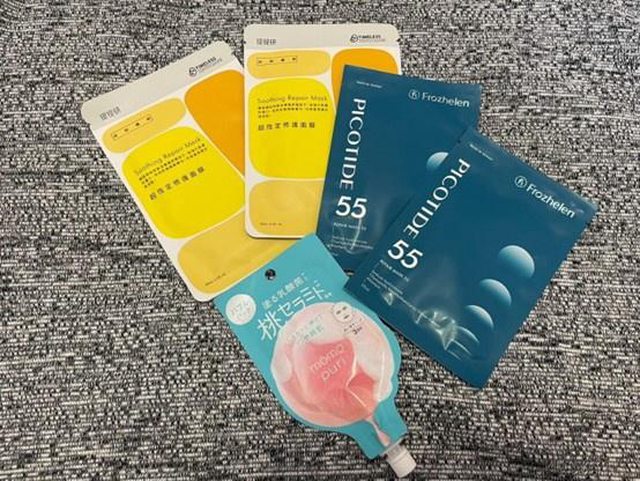 分別是BCL 彈潤蜜桃亮活泡泡面膜、TTM 提提研 超恆定修護面膜、Frozhelen皮可肽肌光修護面膜 PICO 55。