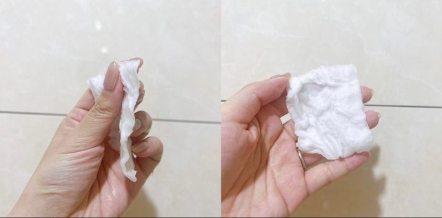 充分浸濕化妝棉後,拿出來攤平,從化妝棉側邊慢慢撕開成五片